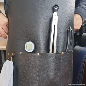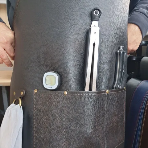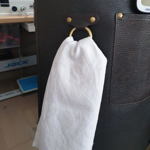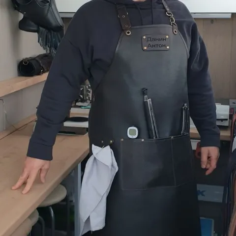 Край фартука прошит кожаной бейкой, что придаёт эстетичный внешний вид и предотвращает загибание краёв.
