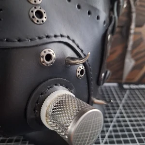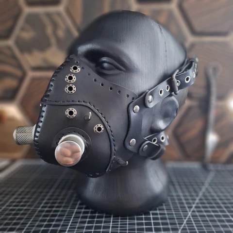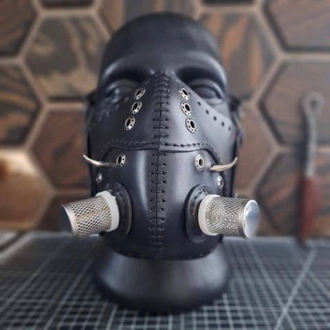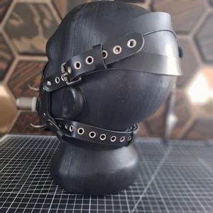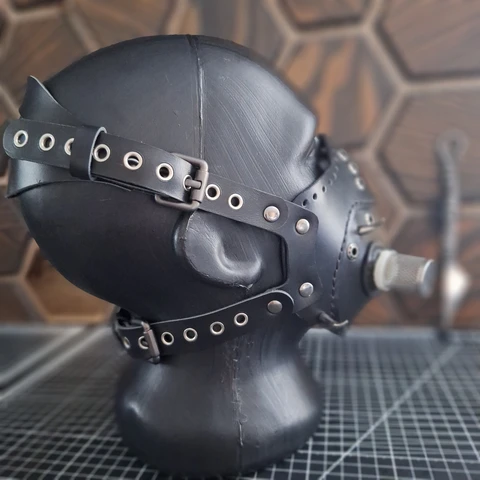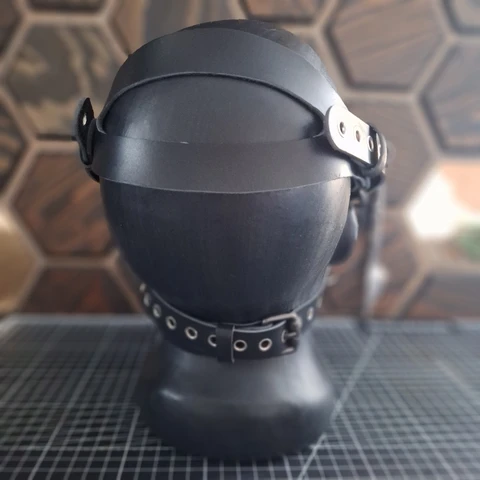 Плотная кожа, хорошо держит форму. Маска не имеет конкретного размера, подойдет на голову взрослого человека. Крепится ремешками с пряжками. Удобно снимается и регулируется