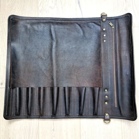 Большая поварская скрутка Ширина 48 см Влезет слайсер Длина 60 см Кант из кожи по периметру придаёт внешний вид и повышает долговечность Плотная прочная кожа. Отсек с молнией Возможны изменения в размерах и конструкции