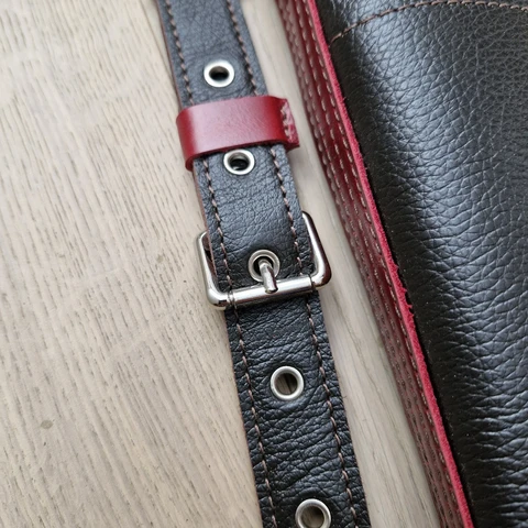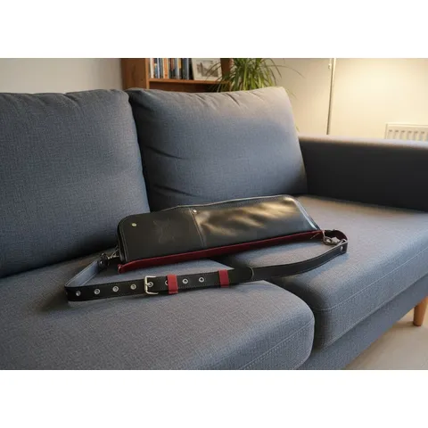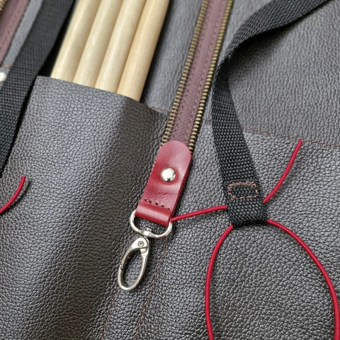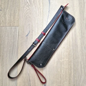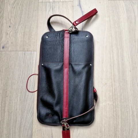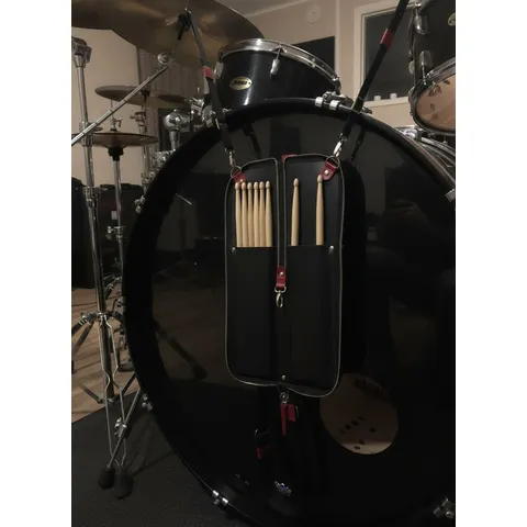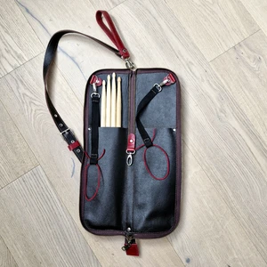 Сумка на молнии из натуральной кожи. Наплечный ремень, петля на руку, петли для подвеса на барабан. Всё на карабинх, что не часто требуется можно легко отцепить. Вместимость 6 пар палочек